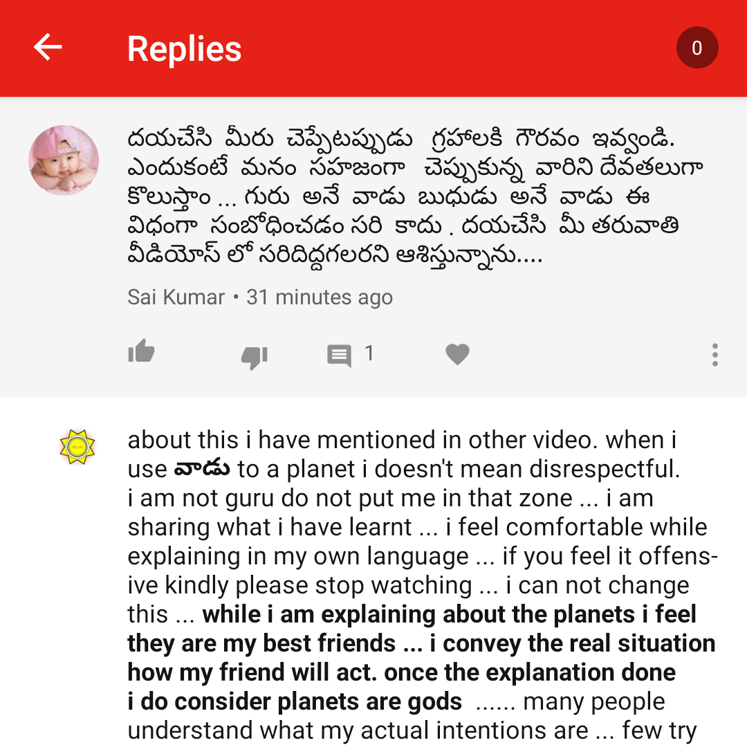 దయచేసి మీరు చెప్పేటప్పుడుగ్రహాలకి గౌరవం ఇవ్వండి. ఎందుకంటే మనం సహజంగాచెప్పుకున్న వారిని దేవతలుగా కొలుస్తాం గురు అనే వాడు బుధుడు అనే వాడు ఈ విధంగా సంబోధించడం సరి కాదు . దయచేసి మీ తరువాతి వీడియోస్ లో సరిదిద్దగలరని ఆశిస్తున్నాను